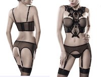 Dessous-Set von Grey Velvet aus transparentem, elastischem Mesh. Häkelspitze mit floralem Muster. Set bestehend aus Top, String und Strapsgürtel.