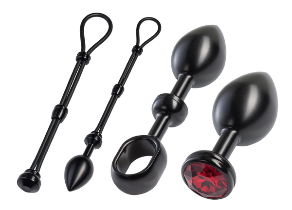 Set bestehend aus Plug, Stoßgriff, Endkappe, Schmuckstein und Cock-Grip. Durch die intelligente Schraubkonstruktion kann der Plug mit den verschiedenen Zubehörteilen, die im Set enthalten sind, verwendet werden. Einfach den Cock-Grip abschrauben und eines der Zubehörteile aufschrauben. 4 verschiedene Kombinationsmöglichkeiten in einem Set - Alu-Plug mit Cock-Grip, Alu-Plug mit Stoßgriff, Alu-Plug mit Schmuckstein oder Cock-Grip mit Endkappe als Penis-/ Hodenring.
