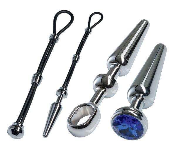 Set bestehend aus Plug, Stoßgriff, Endkappe, Schmuckstein und Cock-Grip. Durch die intelligente Schraubkonstruktion kann der Plug mit den verschiedenen Zubehörteilen, die im Set enthalten sind, verwendet werden. Einfach den Cock-Grip abschrauben und eines der Zubehörteile aufschrauben. 4 verschiedene Kombinationsmöglichkeiten in einem Set - Alu-Plug mit Cock-Grip, Alu-Plug mit Stoßgriff, Alu-Plug mit Schmuckstein oder Cock-Grip mit Endkappe als Penis-/ Hodenring.
