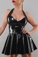 Ein kurzes Kleid aus schwarzem, glänzendem und elastischem Vinyl. Vorne zeichnet es sich durch ein phänomenal betontes Dekolleté, freiliegende Brüste und eine wunderschön betonte Taille aus.