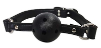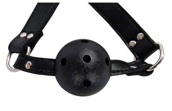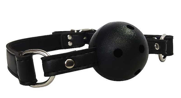 Angenehm zu tragender Knebel mit Nackenriemen und Kunststoll-Ball mit Atemlöchern. Material: Kunstleder und Kunststoff Gesamtlänge: ca. 60 cm Durchmesser Knebel: 4,2 cm