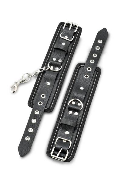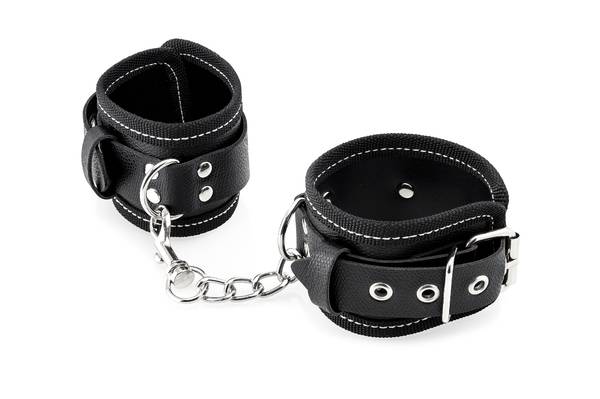 Schwarze, mit einer silbernen Kette verbundene Kunstlederhandschellen, die für Abwechslung im Bett und außerhalb sorgen!
