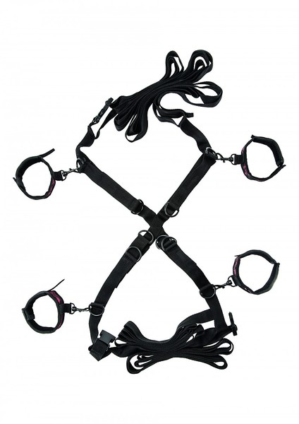 Macht Euer Bett zum BDSM-Kreuz! Wunderschöne Soft-Fesseln mit sicherem Klettverschluss halten Arme und Beine an den D-Ringen, die sich an verschiedenen Stellen an den einstellbaren festen Nylongurten befinden. Diese sind einstellbar bis zu einer Matratzengröße von 457,25 cm (Cal King Size). Die Manschetten passen stufenlos bis zu einem Umfang von 36,75 cm.