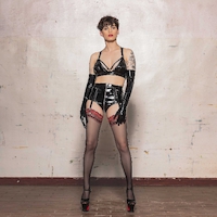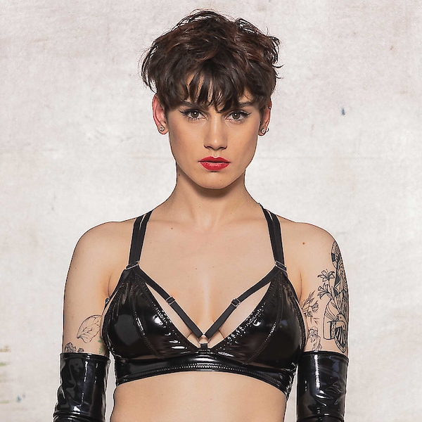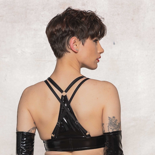 Schwarzer Lack-BH Oberteil mit Stellriemen.