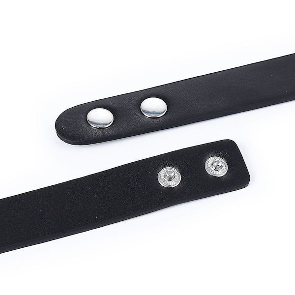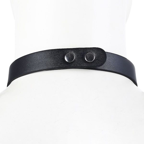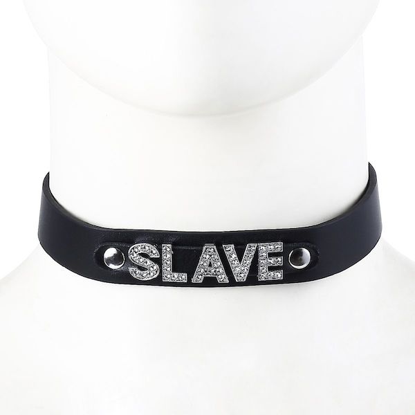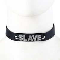 2 cm breites Halsband aus weichem Kunstleder mit Strass-Schriftzug 'SLAVE'. Zweifach mit Druckknöpfen zu schließen. Insgesamt 43 cm lang.