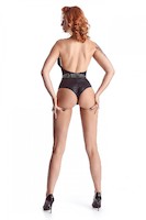 Body aus schwarzem, elastischem und angenehm anzufassendem Stoff und elastischem schwarzem Wetlook. Die Kombination dieser 2 Rohstoffe ist von großer Bedeutung. Im unteren Teil betont der leicht glänzende Wetlook schön die Rundungen von Hüfte und Po. Im oberen Teil legt sich der schwarze Strickstoff schön weich auf die Brust, mit einem sehr auffälligen und eleganten Dekolleté. In der Taillenlinie befindet sich ein schwarzes Ziergummiband mit goldenen Applikationen. Es sieht wunderschön aus, betont aber auch optisch die Taille.