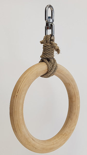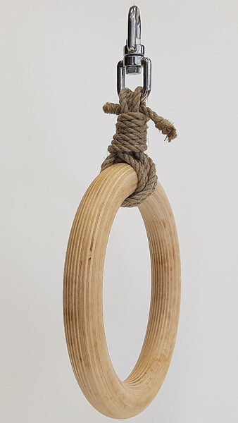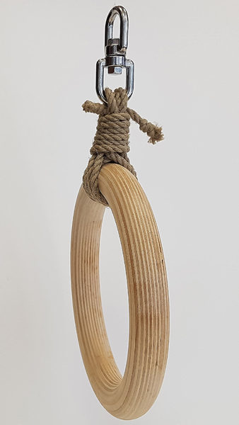 Dieser Bondage Shibari Ring aus poliertem Birkenholz besteht aus dem Ring, einem Hanfseil als Verbindungselement und einem Drehschäkel, der als Aufhängung dient. Einmal befestigt ist der Ring frei drehbar und dient als Aufnahme für die Shibari Seile.