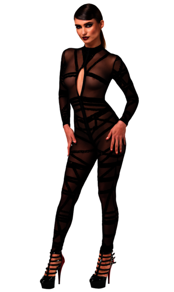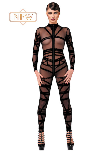 Tauchen Sie ein in die Kunst der Verführung mit diesem atemberaubenden Jumpsuit aus beflocktem Tüll im Bondage-Stil. Inspiriert von der komplexen Schönheit des Shibari umhüllt sein Design den Körper wie zarte Seile und erzeugt einen fesselnden visuellen Effekt. Die langen Ärmel und Beine sorgen für eine schlanke Silhouette, und der Drei-Wege-Reißverschluss bietet individuelle Sichtbarkeit und mühelosen Zugang – perfekt für alle, die mit jeder Bewegung necken und stärken möchten.