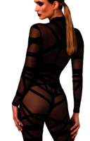 Passform: Der dehnbare Tüll schmiegt sich wie eine zweite Haut an den Körper und passt sich jeder Kurve an, während er gleichzeitig eine schmeichelhafte und stromlinienförmige Form bewahrt. Die geschickte Platzierung des Shibari-inspirierten Musters betont die Taille und betont die weiblichen Proportionen, wodurch eine markante, selbstbewusste Silhouette entsteht.