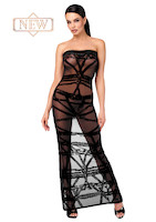 Tauchen Sie ein in die Kraft der Sinnlichkeit mit diesem faszinierenden langen Kleid aus beflocktem Tüll mit einzigartigem Bondage-Muster. Es ist ein faszinierendes Design, das gewagte Eleganz mit modernem Charme verbindet und einen Look kreiert, der alle Blicke auf sich zieht.