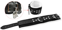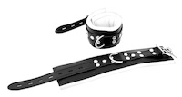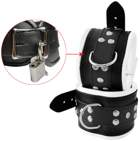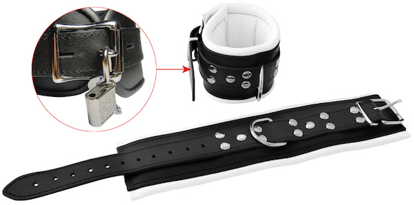 Fußfessel aus robustem Leder. Farbe: weiss/schwarz. Innen mit weichem Leder gepolstert. D-Ring geschweißt (inkl. 2 Schlösser). Fußfessel: Länge: ca. 30 cm / Breite: ca. 8 cm.