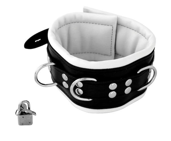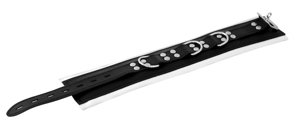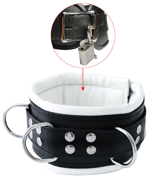 Halsfessel aus robustem Leder. Farbe: weiss/schwarz. Innen mit weichem Leder gepolstert. D-Ring geschweißt (inkl. 1 Schloss). Halsfessel: Länge: ca. 42 cm / Breite: ca. 8 cm.