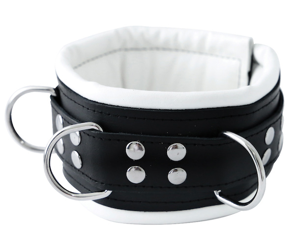 Halsfessel aus robustem Leder. Farbe: weiss/schwarz. Innen mit weichem Leder gepolstert. D-Ring geschweißt. Halsfessel: Länge: ca. 42 cm / Breite: ca. 8 cm.