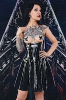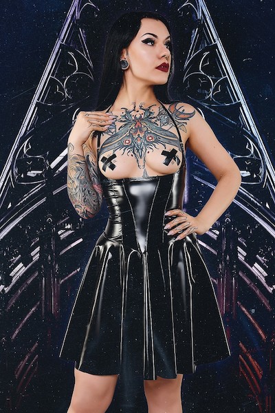Kurzes Kleid mit freiliegendem Ausschnitt. Komplett aus schwarzem elastischem Vinyl. Dank der dehnbaren Eigenschaften des Stoffes passt es sich perfekt dem Körper an und betont dessen Vorzüge, insbesondere die Taille. Hinten gibt es eine Schnürung. Es ist optisch schön, erleichtert aber auch die Montage des Produkts. Am Hals befindet sich ein schwarzes verstellbares Gummiband.