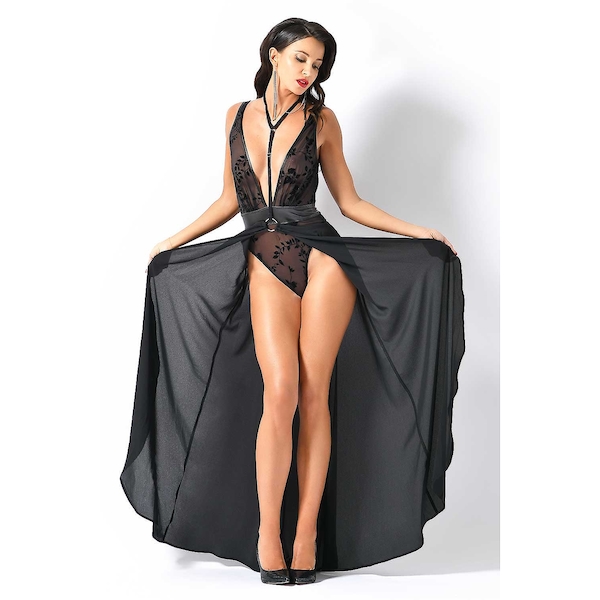 Langer Krepprock. Verschluss im Rücken mit abnehmbarem Halsteil. OHNE Body.