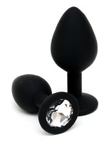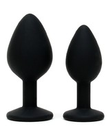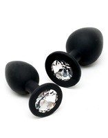 Analstöpselset mit zwei Plugs aus samtigem Silikon und weißem Schmuckstein in zwei Größen. Durchmesser 2,8 x 7,2 cm Durchmesser 3,8 x 8 cm