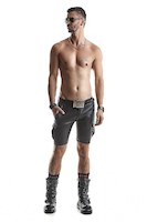 Effektvolle Cargo-Shorts aus schwarzem, elastischem Wetlook mit abgesenkter Taille. An Hüfte und Beinen sind sie etwas lockerer geschnitten. Sie haben 6 funktionelle Taschen. Zwei Taschen vorne, 2 hinten und 2 an den Oberschenkeln. Dank dessen ist es kein Problem, Ihr Telefon, Ihre Brieftasche und andere kleine Gegenstände zu verstecken.