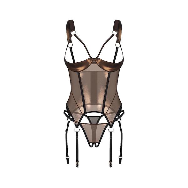 Entdecke ein verführerisches Dessous-Design, das Eleganz mit Sinnlichkeit und einer raffinierten Verarbeitung verbindet. Dieses zweiteilige Set kombiniert stilvolle Details mit subtiler Transparenz und betont jede Kurve auf ansprechende Weise. Das Korsett schmiegt sich dank stützender Bügel und formender Stäbchen an den Körper an und bietet leichte Struktur ohne Komfortverlust. So entsteht eine elegante Silhouette mit einer verführerischen Ausstrahlung.