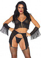 4-teiliges Set: enthält ein Netz-Top mit Fransen, String, einen Fransen-Strumpfgürtel und passende Armteile.