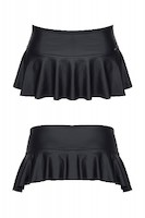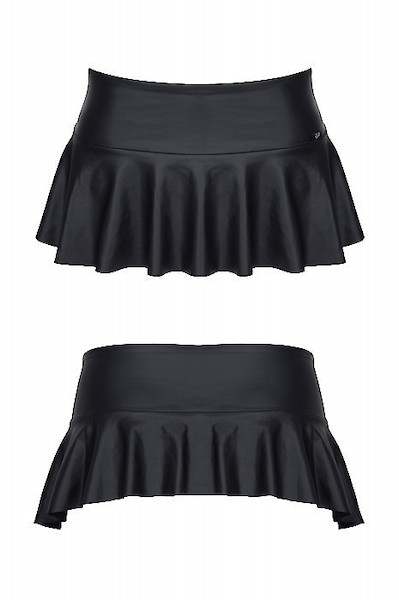 Klassischer Minirock aus elastischem schwarzem Wetlook. Vorne länger und hinten verkürzt für einen sexy Blick auf das Gesäß. Perfekt für Spaß und Provokation.