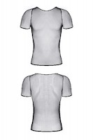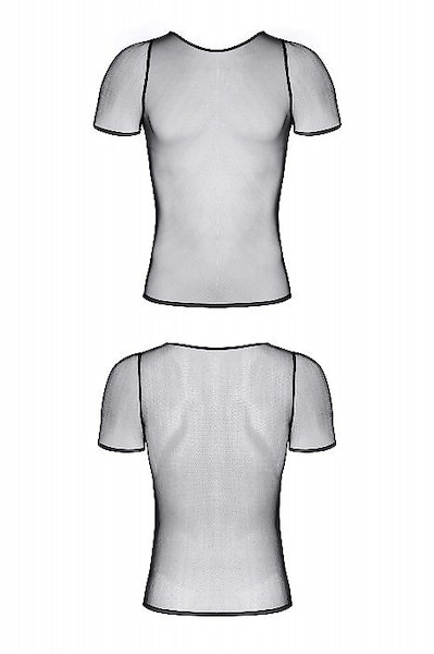 T-Shirt aus elastischem schwarzem Mesh. Hals und Ärmel mit elastischem schwarzem Wet-Look-Tape gefüttert. Es passt sich perfekt dem Körper an und betont seine Qualitäten.