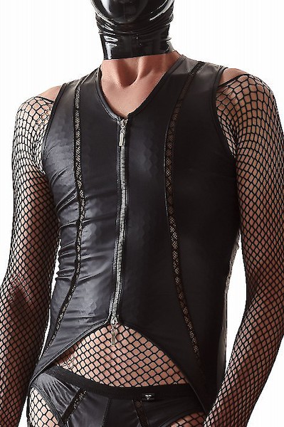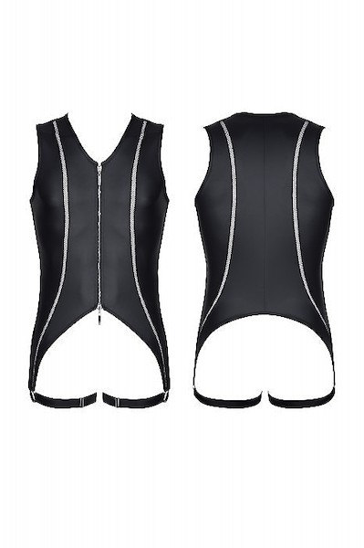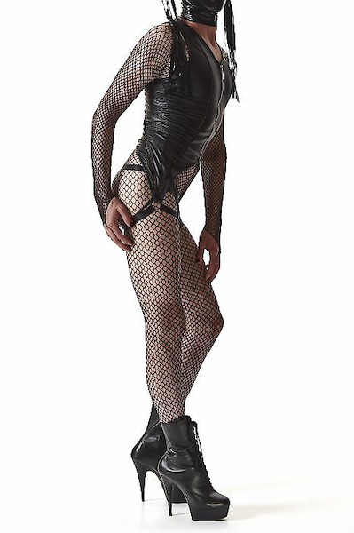 Ein auffälliger schwarzer Wetlook-Body. Zierelemente aus schwarzem Mesh an den Frontseiten. Doppelseitiger Reißverschluss vorne mit dekorativen Reißverschlüssen. Der Body endet an den Seiten unterhalb der Gesäßlinie mit einem schwarzen Soft-Touch-Gummiband mit Metallverstellern. Hinten zeigt die Kreisform sinnlich das nackte Gesäß.