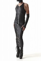 Auf der Rückseite befindet sich eine Komposition aus schwarzen, angenehm anzufassenden Gummibändern und Metallringen und Reglern. Das Kleid lädt mit offenem Gesäß und zahlreichen Reißverschlüssen zu faszinierenden und würzigen Provokationen ein.