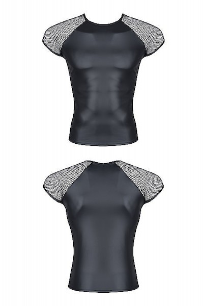 T-Shirt aus schwarzem, elastischem Wetlook, mit schwarzen Mesh-Ärmeln. Ärmel gefüttert mit elastischem schwarzem Wetlook-Tape. Dank der elastischen Eigenschaften des Stoffes passt sich das T-Shirt perfekt dem Körper an und betont seine Qualitäten. Die Ärmel aus schwarzem Mesh verbreitern optisch die Schultern.