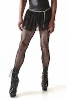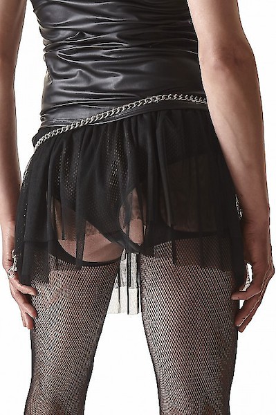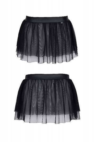 Kurzer Minirock komplett aus schwarzem Mesh. Der obere Teil verfügt über einen schwarzen Wetlock-Riemen mit einem elastischen Band für eine einfache Passform. Der Rock sieht beeindruckend aus, dank der zahlreichen Netzschichten, die sich schön auf Hüften und Gesäß verteilen.