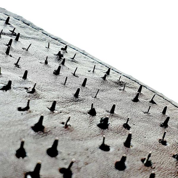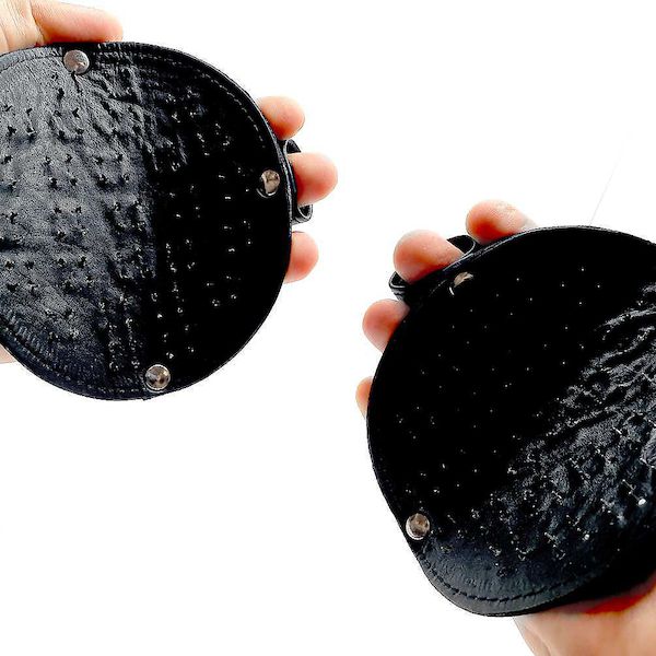 Leder Pad mit Dornen besetzt. Die Fingerschlaufe sorgt für guten Sitz beim Bearbeiten des Spielpartners.