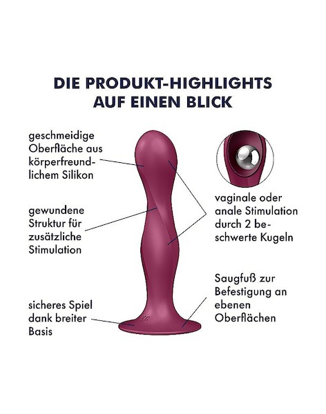 In diesem Toy bebt es gewaltig: Zwei beschwerte Kugeln bewegen sich frei in seinem Inneren und sorgen so für ein unvergleichliches Gefühl in Deinem Inneren. Ob für Deine Solo-Time oder als Strap-on, der Satisfyer Double Ball-R aus hautfreundlichem Silikon wird Dich mit seinen inneren und äußeren Werten überzeugen! Der Satisfyer Double Ball-R bringt sich selbst zum Schwingen und Dich zum Zittern – und das ganz ohne Motor und Vibrationsprogramme! In seinem Inneren befinden sich zwei beschwerte Kugeln, die bei jeder Bewegung frei umherschwingen und so ein unwiderstehlich erregendes Gefühl erzeugen. Dabei ist dieses einzigartiges Lovetoy durch seine Oberfläche aus streichelweichem Silikon gleichzeitig besonders zärtlich zu Dir und Deiner Haut. Außerdem glänzt der Satisfyer Double Ball-R durch seine Vielseitigkeit. Möchtest Du ihn als Anal- oder Vaginaldildo verwenden? Kein Problem, denn dank seiner breiten Basis ist er für beides perfekt geeignet. Apropos breite Basis: Die hat bei diesem Schätzchen die zusätzliche Funktion eines Saugfußes, der auf ebenen Flächen haftet. So hast Du bei der Solo-Time die Hände frei für zusätzlichen Spaß – zum Beispiel für zusätzliche Klitorisstimulation. Gewicht 224 g Länge 179 mm Durchmesser 76 mm Material Silikon, ABS Kunststoff Farbe dunkelblau