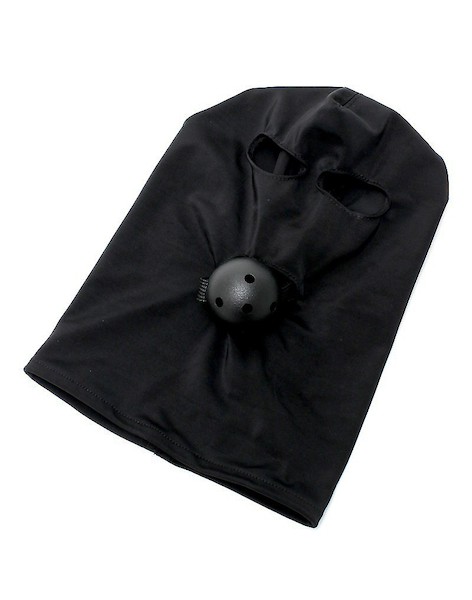 Hochelastische Kopfhaube mit Augenöffnungen und integriertem Ballknebel aus Plastik mit Atemlöchern.