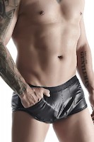 Shorts aus schwarzem, elastischem Material / versteckte Taschen mit Eingriff auf beiden Seiten / Schnitt auf der Rückseite betonen schön die Rundungen des Gesäßes / elastisches Wetlook-Material / angenehmes breites Gummiband um die Taille / verstärkte Nähte