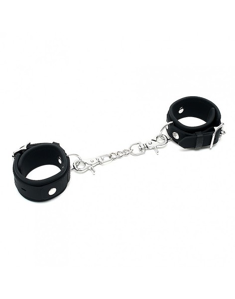 4 cm breite Hand- oder Fußfesseln aus samtweichem, stabilem Silikon mit D-Ringen und verschließbaren Schnallen mit Karabinerkette. Verstellbar von 17 bis 25 cm.