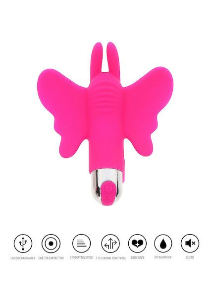 Der Butterfly Pleaser Rechargeable passt perfekt auf Ihre Fingerspitze, sodass Sie ein orgasmisches Glück genießen können. Übernehmen Sie die volle Kontrolle über Ihre Spielsitzung mit nur einer Berührung und lassen Sie die spielerischen Vibrationen die Arbeit erledigen. Dieses Mini-Massagegerät besteht aus 100 % reinem Silikon, verfügt über 7 Vibrationsgeschwindigkeiten, 7 pulsierende Funktionen und ist über USB wiederaufladbar.