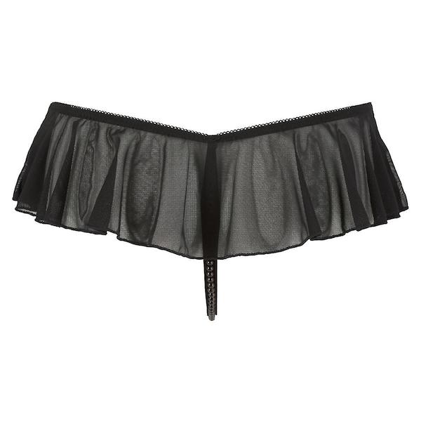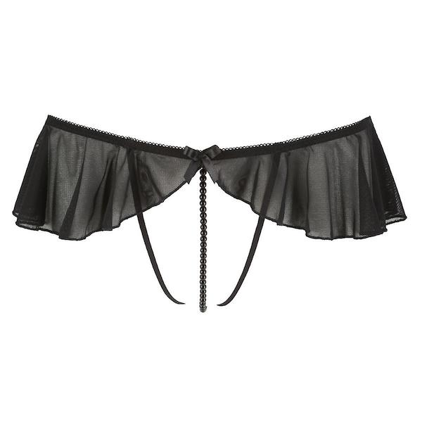 Dieser G-String mit offenem Intimbereich wird mit einer anregenden Perlenkette geliefert. Der Spitzenrock garantiert einen provokanten Look. Der G-Tanga ist dank elastischer Riemen angenehm zu tragen.