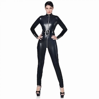 Catsuit aus elastischem Veganleder mit langen Arm und durchgehendem 3-Wege-Reißverschluss bis durch den Schritt. Ebenso finden sich Reißverschlüsse an den Ärmeln. (Ohne Gürtel)