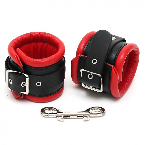 Aus Rindleder hergestellte massive Fußfesseln mit rotem Innenpolster. Stark vernietet und mit D-Ringen und Doppelkarabiner versehen. Verstellbar zwischen ca. 36 und 28 cm.