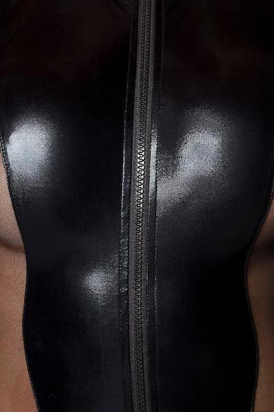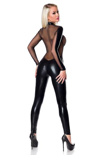 sexy Gogo Overall aus Wetlook Material mit transpareneten Mesh-Einsätzen kleiner Stehkragen Kunststoffreißverschluss in der vorderen Mitte aus elastischem Material