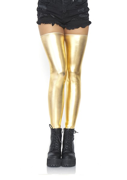 Halterlose goldene stretchige Wetlook Strümpfe.