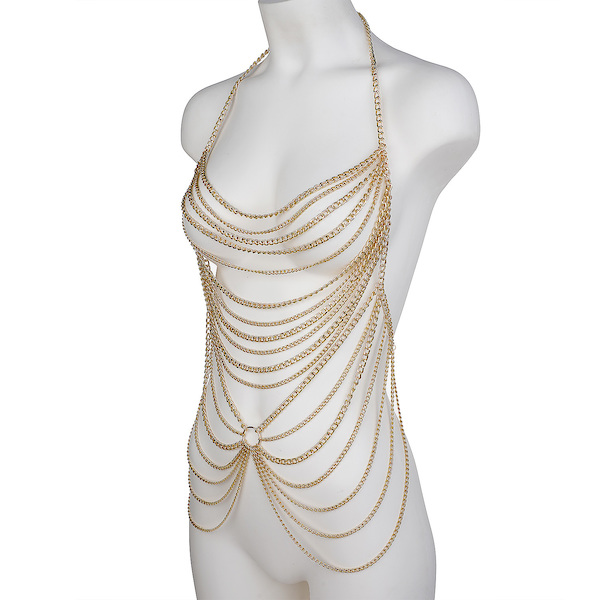 Großartiger Körperschmuck aus goldfarbenen Metallketten. Über mehrere Größen verstellbar.
