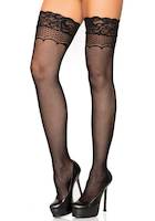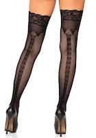Halterlose Strümpfe aus feinem Netz mit Spitzenbund und rückseitiger Naht mit Schleifen.