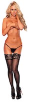 Schwarze halterlose Strümpfe mit Spitze und Korsettoptik hinten.