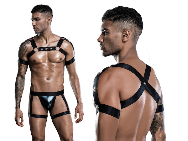 Mehrteiliges Bondage Outfit, Top im Harnness-Stil, Shorts mit transparentem Rückteil, aus glänzendem Kunstleder und Gummi. Hochwertige Qualität von SARESIA MEN roleplay.