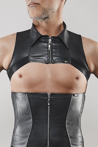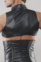Crop-Top mit dekorativem dunklen Reißverschluss vorne. Aus schwarzem Wetlook. Zierelement aus perforiertem Wetlook auf der Vorderseite. Der Kragen ist gepolstert. Schwarzes, breites und angenehm anzufassendes Gummiband unten. Auf dem Reißverschluss ist das Logo von RFP Regnes Fetish Planet eingraviert.