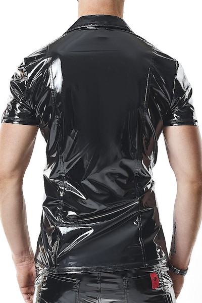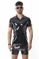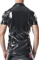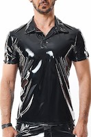 Klassisches Poloshirt mit elegantem Kragen, der mit einer Regenbogenflagge verziert ist. Auf der Rückseite des Kragens befindet sich ein dekorativer und funktionaler Metallring. Komplett aus schwarzem, elastischem PVC gefertigt. Dieser betont die Brustform auf der Vorderseite wunderschön.