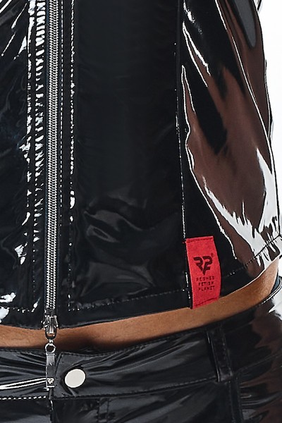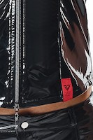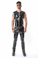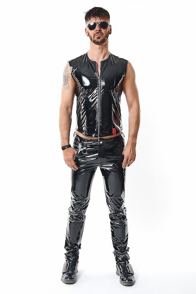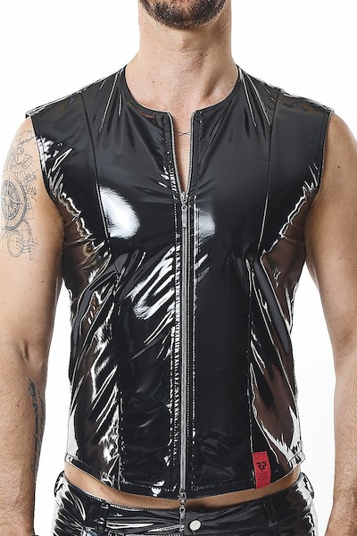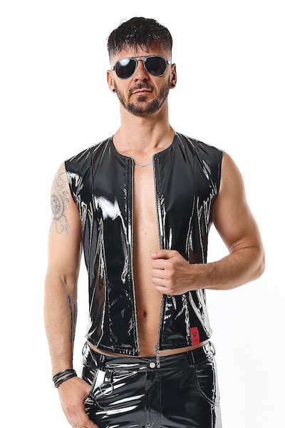 Einzigartige, moderne Weste aus schwarzem, elastischem PVC. Vorne befindet sich ein dunkler abnehmbarer Reißverschluss, der sich sowohl von oben als auch von unten öffnen lässt. Die Reißverschlüsse sind mit dem Logo von RFP Regnes Fetish Planet eingraviert. Auf der Vorder- und Rückseite befinden sich vertikale Nähte, die für einen einzigartigen Look sorgen und gleichzeitig die Taille optisch verschlanken und die Schulter- und Brustlinie verbreitern, wodurch eine muskulösere Silhouette entsteht.