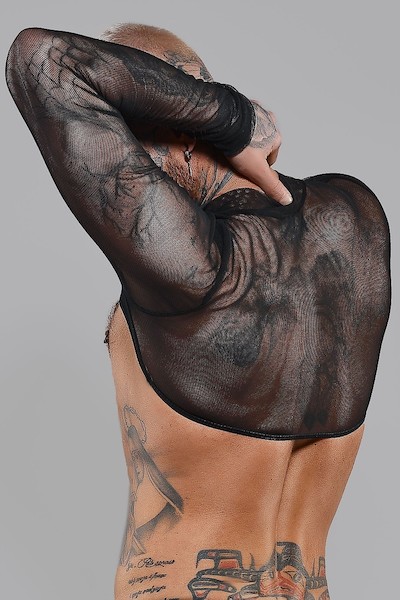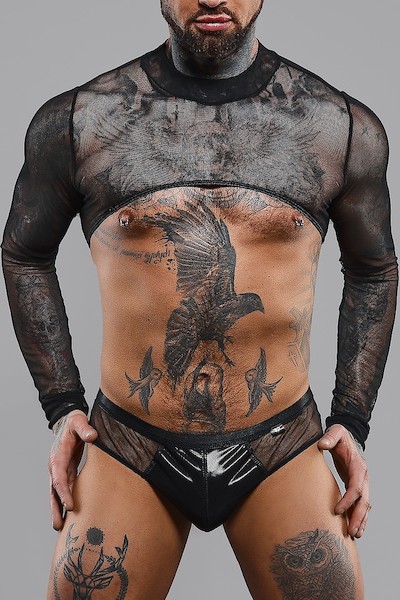 Crop Top komplett aus sehr dehnbarem und elastischem Tüll in Schwarz. Es verbreitert Schultern und Brust wirkungsvoll und gibt den Blick auf den nackten Rücken und Oberkörper frei. Ermöglicht den Zugang zu den Brustwarzen, die beim Spielen genutzt werden können und sollen. Im unteren Bereich und an den Ärmeln ist es mit einem Gummiband versehen. Diese Lösung und die elastischen Eigenschaften des Materials sorgen für eine perfekte Passform und betonen seine Vorteile.