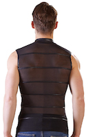 Schwarzes, ärmelloses Shirt aus transparentem Powernet, unterbrochen von matt-schwarzen Streifen mit kleinem Stehkragen und durchgehendem Reißverschluss in der Front.