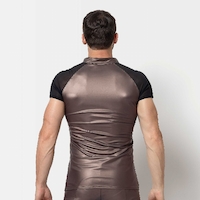 Ausgefallenes brozefarbenes Club-Shirt für Ihn mit transparenten Ärmeln und Reißverschluss an der Brust.